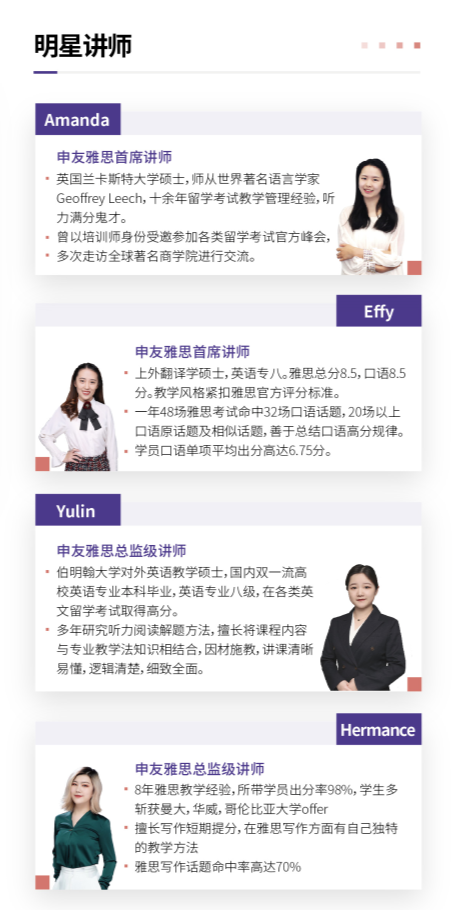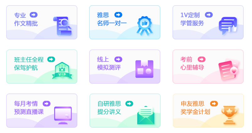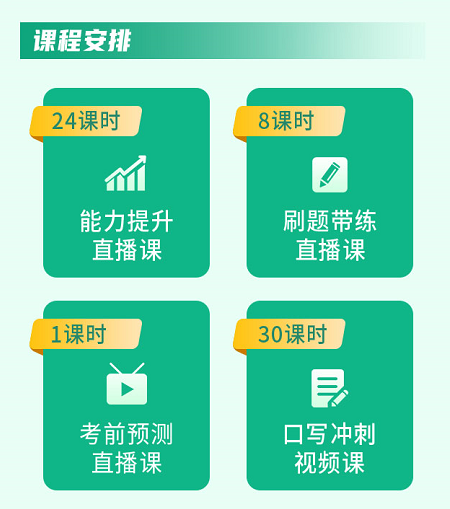 基础5.0-6.0,目标分6.5-7.5 备考时间紧张,需要短期特训 最后冲刺阶段,想要攻破瓶颈 课程服务