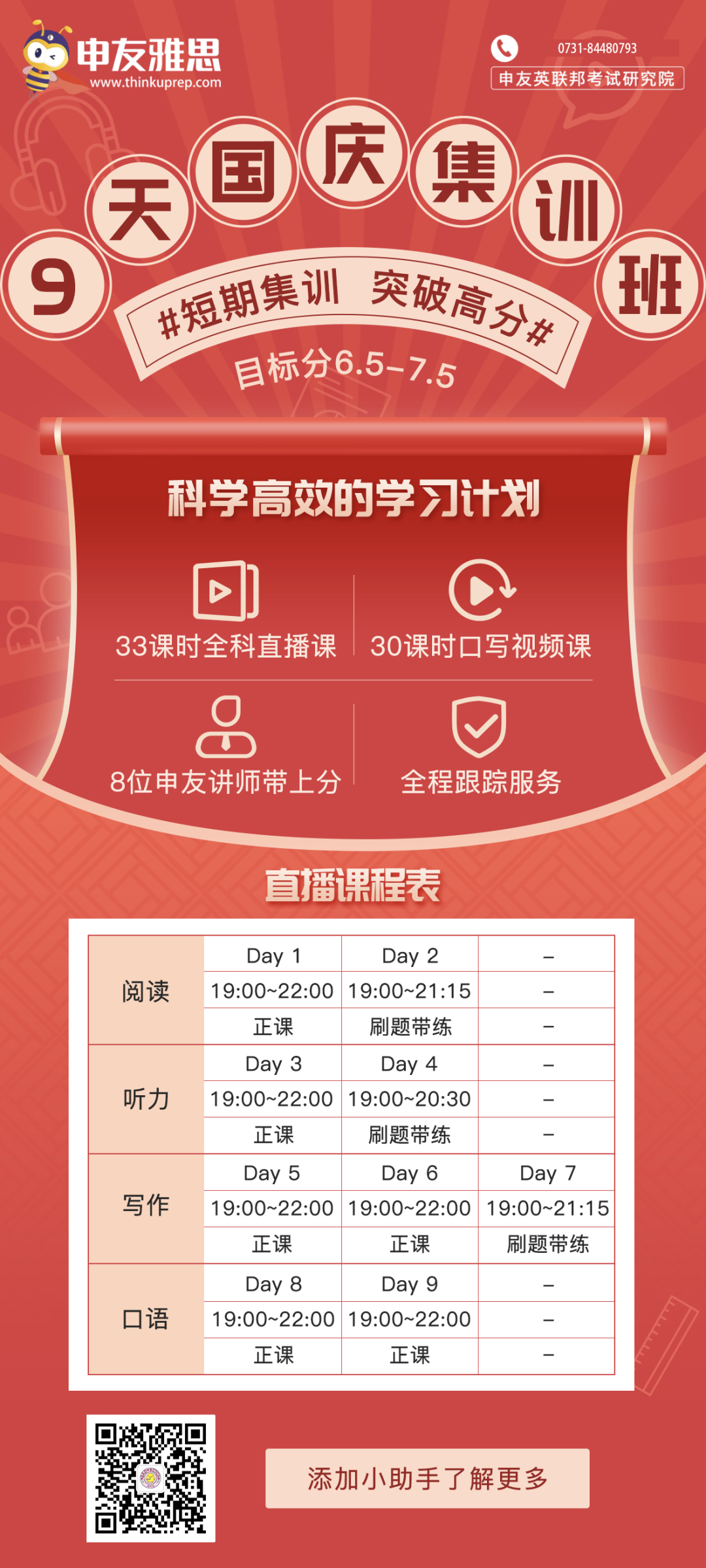 申友雅思推出了【国庆雅思班】 一共集中授课9天时间 同时配有超值的课程配套服务 报名即送: 《9-12月雅思口语题库及高分答案》精美纸质版 1.九天集训班介绍